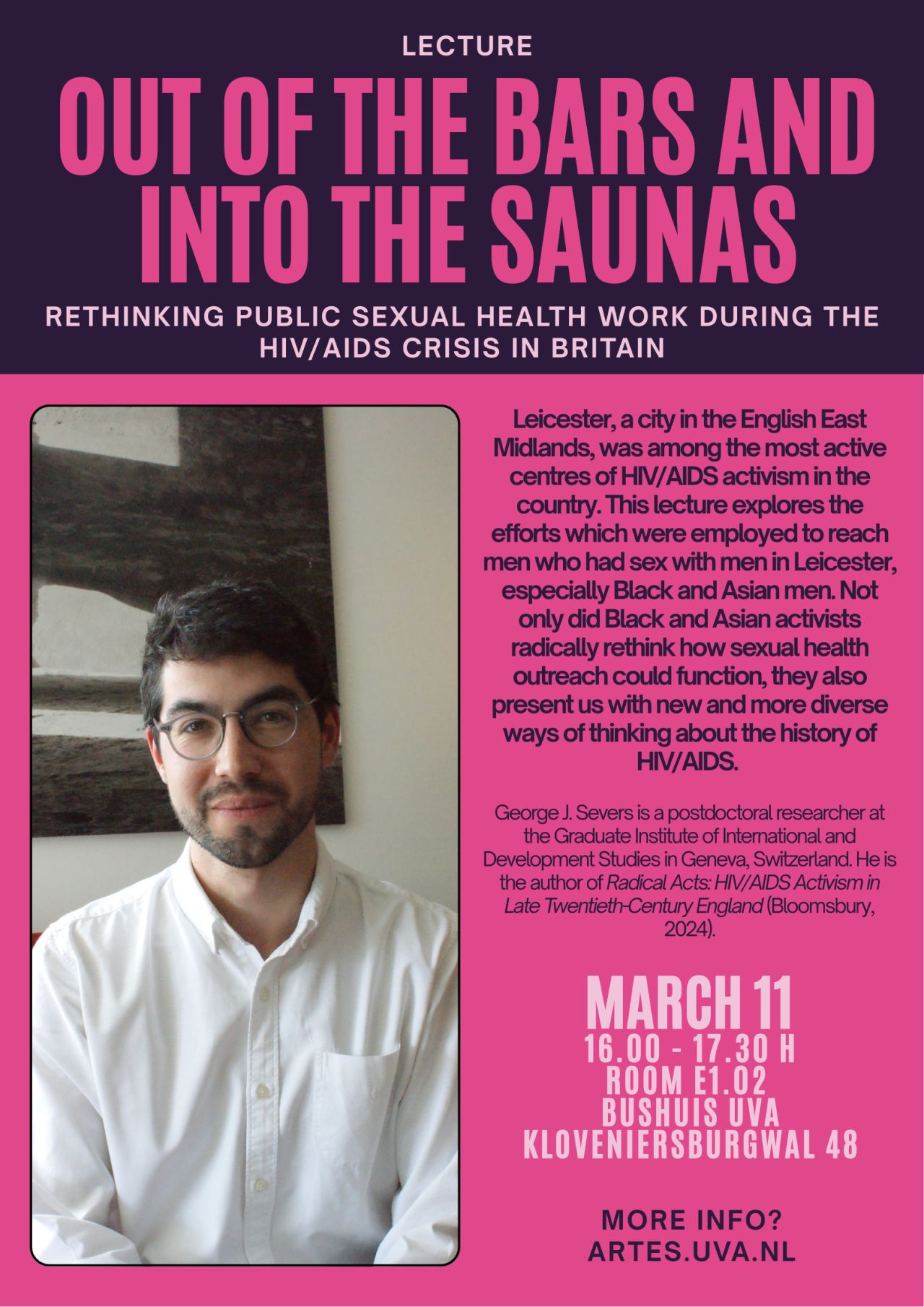 Wednesday March 11, 2026 George Severs will give a talk titled “Out of the Bars and into the Saunas: Rethinking Public Sexual Health Work During the HIV/AIDS Crisis in Britain.” Focusing on Leicester, George will rethink how sexual health outreach functioned in the 1980s.