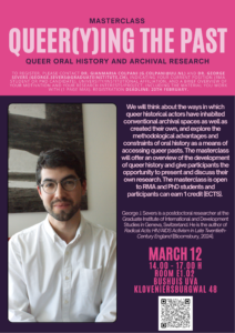 The masterclass is formed of two parts. In the first part, George Severs will offer an overview of the topic through an interactive lecture, which will include group discussions of source material and methodological approaches to queer history. In the second part, participants will present their own work to the group, gaining feedback on their ideas and approaches.